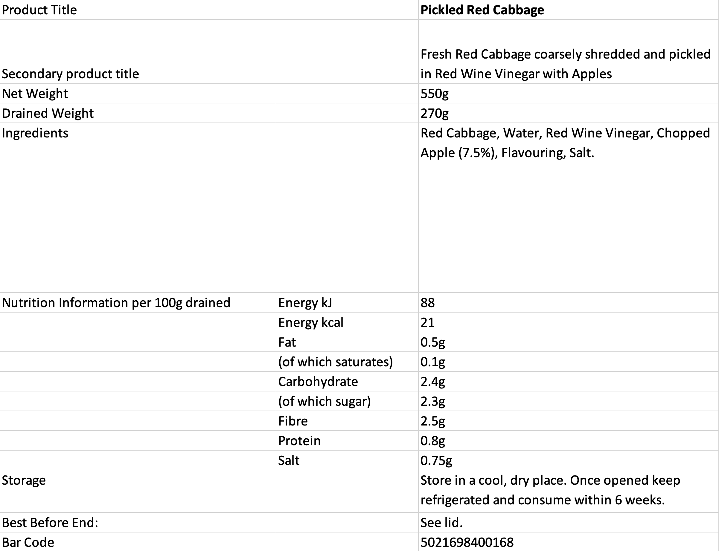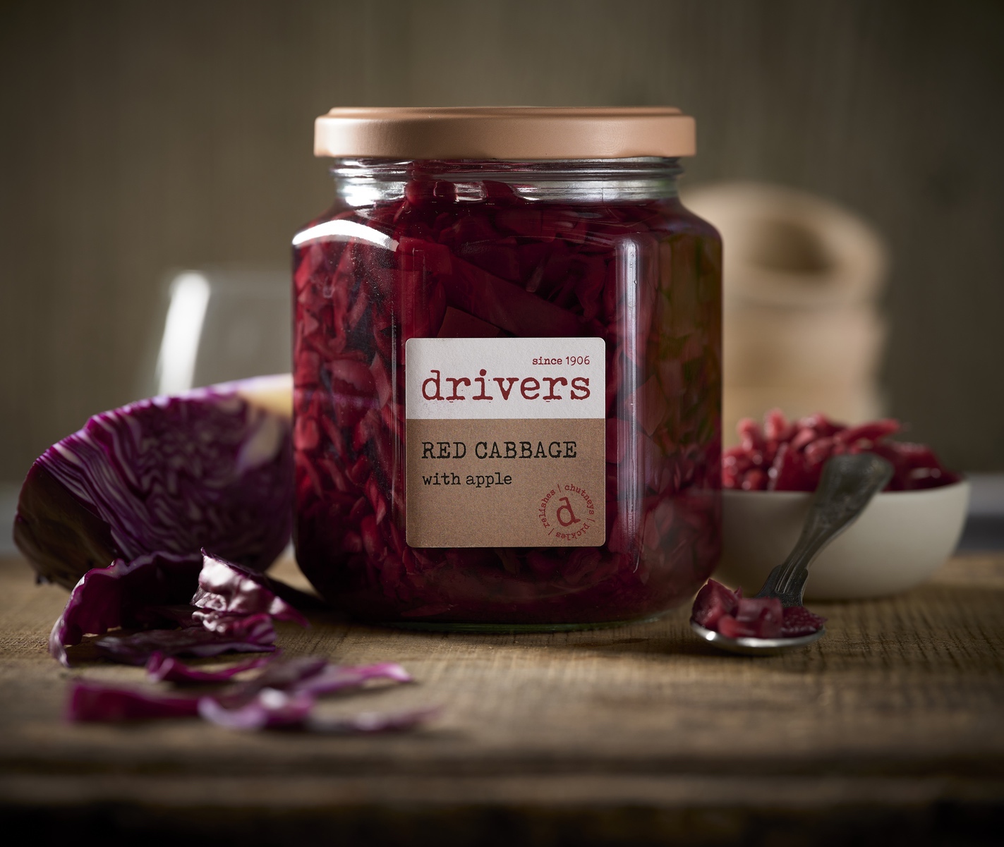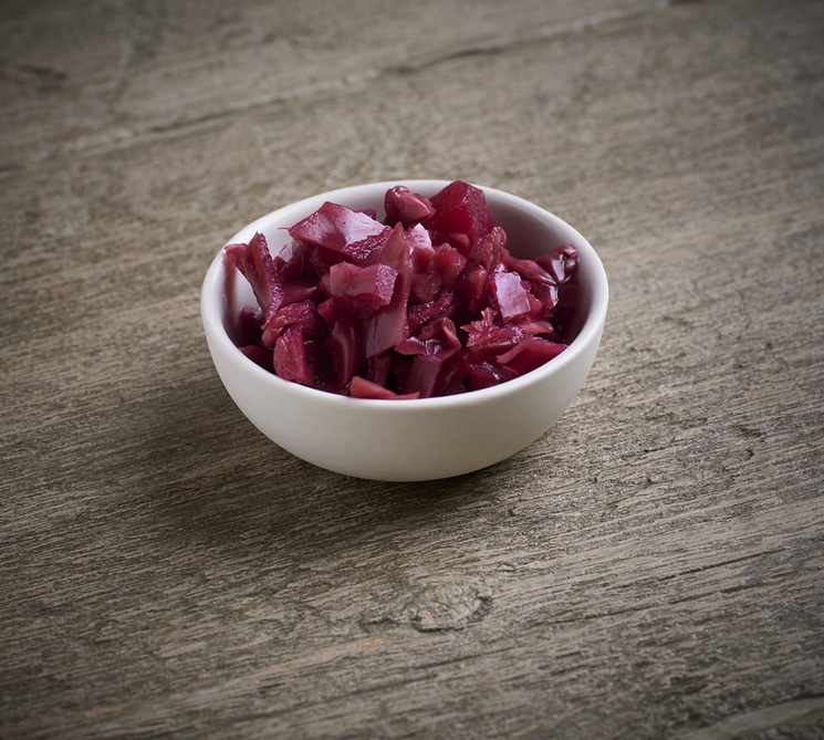Coarsely shredded red cabbage combined with chunks of apple, perfectly pickled in red wine vinegar.